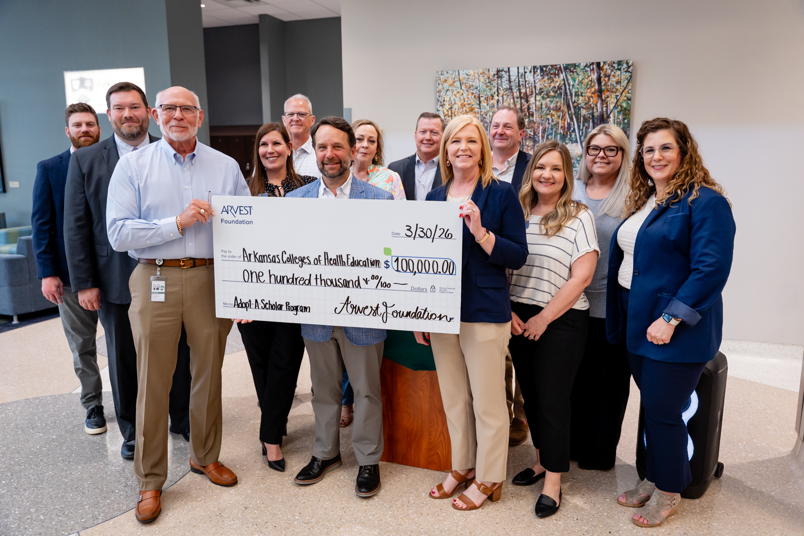 Fort Smith, AR. – The Arkansas Colleges of Health Education (ACHE) announces a new partnership with Arvest Foundation through the establishment of the Adopt A Scholar 2026 ARCOM Recruitment Scholarship. Arvest representatives visited campus today, Monday, March 30, for a formal check presentation in support of this initiative.